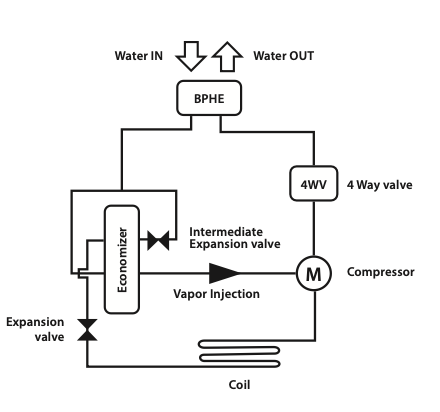 Leidingdiagram koudemiddel met economizer voor dampinjectie
