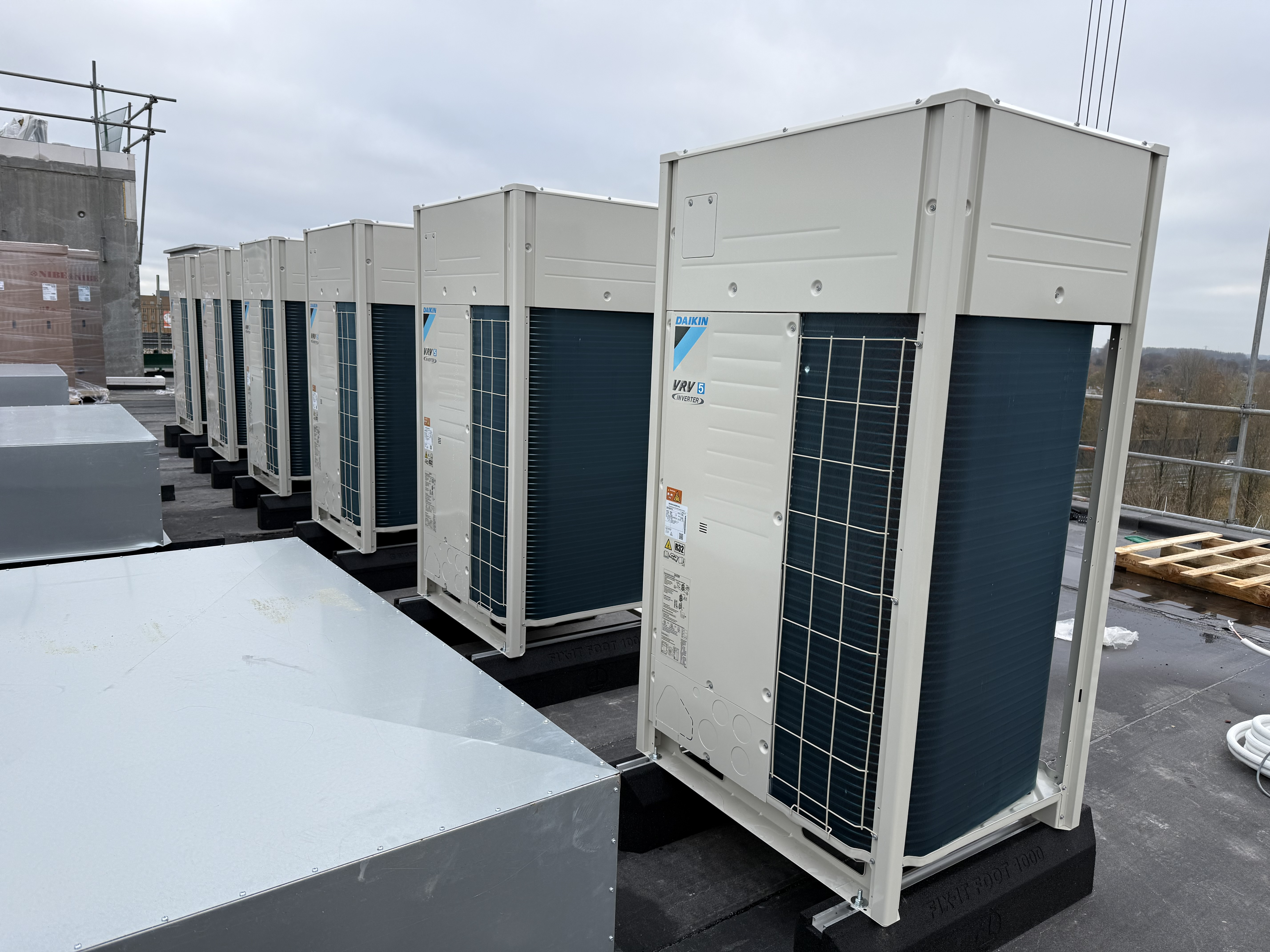Voor de uitbreiding is gekozen voor een Daikin VRV 5-systeem in een 3-pijpsconfiguratie, bestaande uit elf buitenunits. Deze oplossing maakt het mogelijk om per kamer individueel te koelen of te verwarmen, terwijl gelijktijdige vraag in verschillende ruimtes probleemloos wordt gefaciliteerd. Door warmte- en koude-uitwisseling tussen kamers wordt bovendien efficiënter met energie omgegaan.