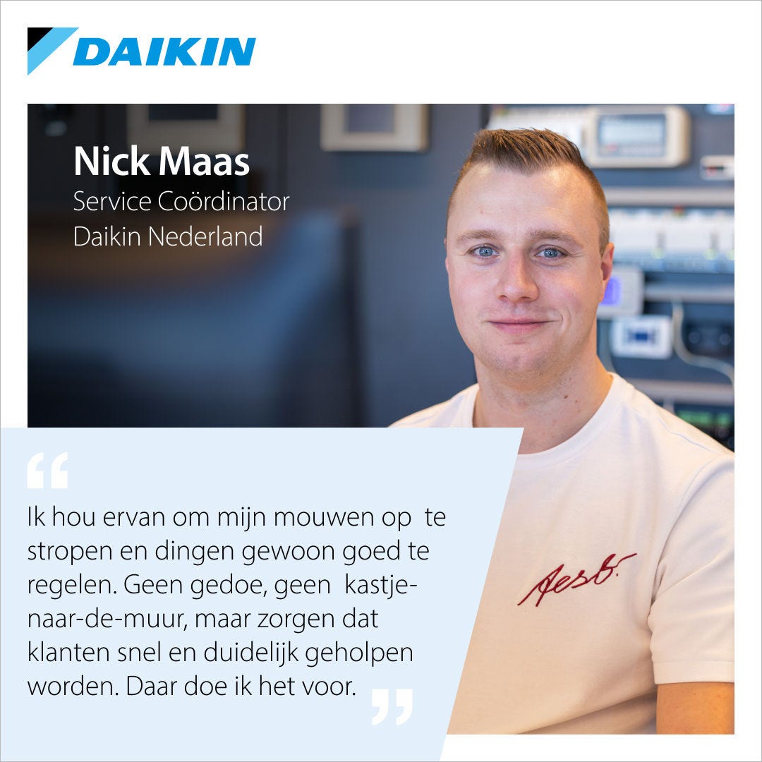 Toen Nick Maas, Service Coördinator bij Daikin, drie jaar geleden begon bij Tech Support, was dat een bewuste keuze om iemand met technische aanleg, maar zonder koeltechnische ervaring, een kans te geven. “Daikin geloofde erin dat iemand met de juiste instelling en leergierigheid zich kon ontwikkelen tot volwaardig Techsupport medewerker.” En dat lukte — mede omdat hij direct opgenomen werd door collega’s die hun vak verstaan en hun kennis graag delen.