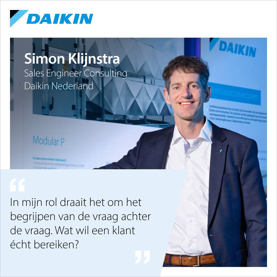 Simon laat zien hoe consulting bij Daikin draait om visie, samenwerking en strategische oplossingen die écht impact maken. Hij begeleidt projecten van idee tot oplevering, verbindt techniek met lange termijnwaarde en bouwt aan duurzame relaties die het verschil maken.