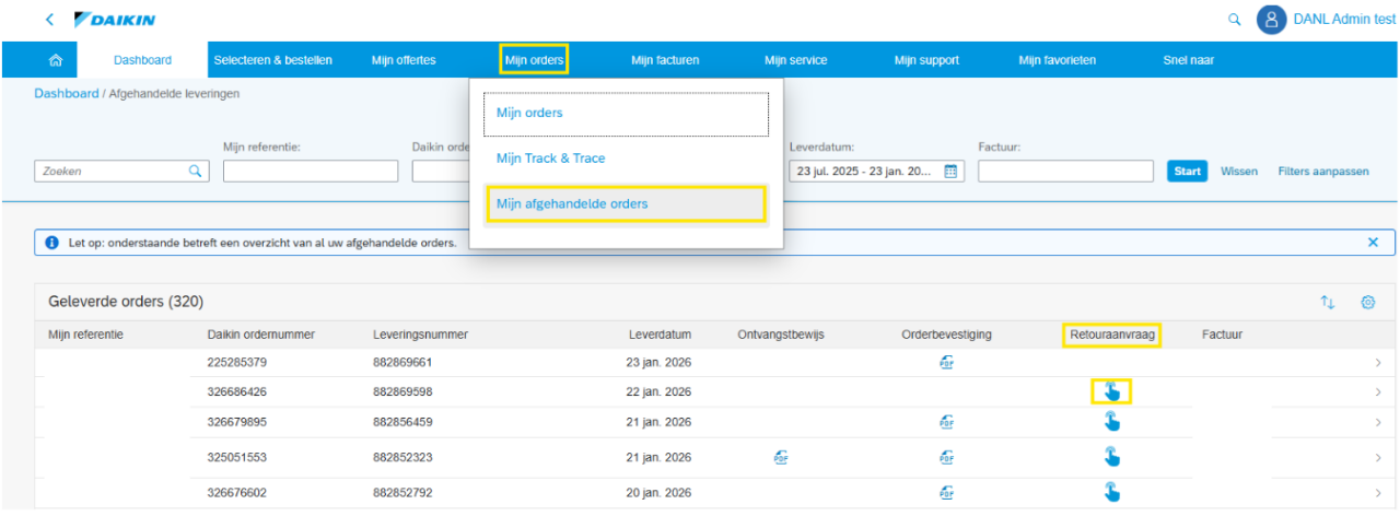 In de rubriek "Mijn afgehandelde orders" worden bestellingen weergegeven welke reeds geleverd zijn.